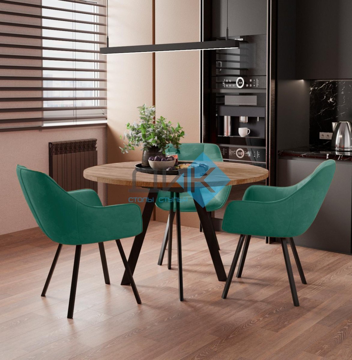 - Стол DikLine RD120 со стульями DikLine 252M. Сочетание ЛДСП “под дерево” и ярких стульев - подходит для современных интерьеров.