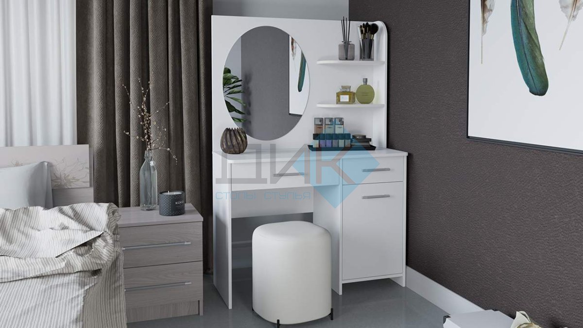 Трюмо с зеркалом Эвита выполнено в текстуре белый глянец. Модель оснащена вместительными ящиками и полками для храния косметики и разных принадлежностей.