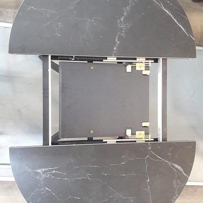 Подстолье: опоры металлические. Механизм раскладки - синхронный легкого скольжения, вставка - бабочка с керамикой (полуавтомат) 35 см.